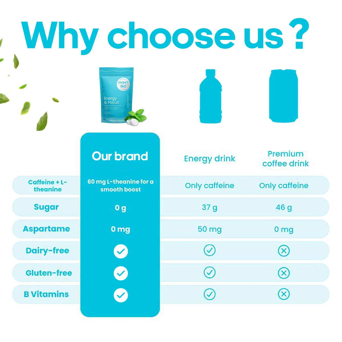 Energy Caffeine Mints (90 Pieces) - Sugar Free with L-theanine + Natural Caffeine + Vitamin B12 & B6 - Nootropic Energy & Focus